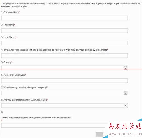 3、填寫內(nèi)容從上到下:公司名、本人名、本人姓、電子郵件地址、國家、公司員工數(shù)量、公司主營業(yè)務(wù)、是否為微軟合作伙伴(是不是都可以)、是否愿意被邀請參與未來的Office預(yù)發(fā)行版本測試。填寫之后點(diǎn)擊“Submit”提交。