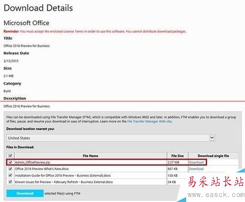 6、在頁面下方是Office安裝程序以及說明文件列表,用戶可以按需下載文件。如果您只想要安裝程序,點(diǎn)擊第一項(xiàng)Admin_OfficePreview.zip后面的“Download”下載即可。