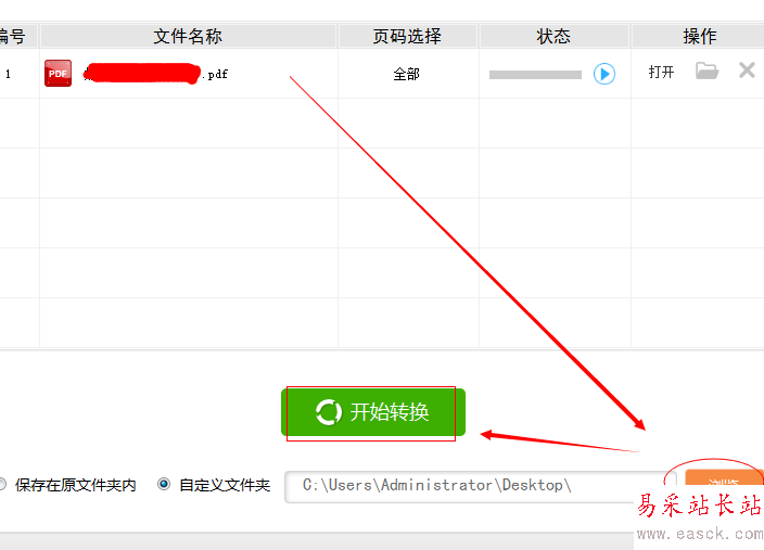 然后自定義輸出位置,也可以默認為桌面,自定義保存位置的話點擊“瀏覽”進行選擇。最后開始轉換。