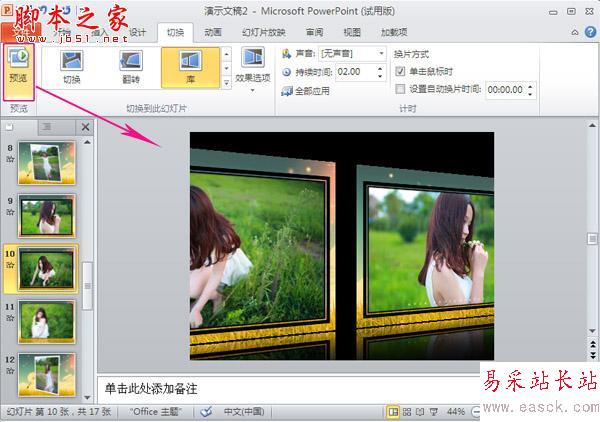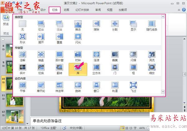 現(xiàn)在我們來設(shè)置照片的動畫特效:小編做的這個(gè)PPT相冊是每一張照片就是一張幻燈片,你也可以做成多張照片為一張幻燈片。我們利用“切換”特效來設(shè)置動畫效果,依次選中每一個(gè)幻燈片,然后在“切換”中選擇一種滿意的“切換方案”即可,非常簡單!