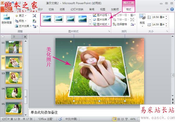 接下來就需要美化照片,單擊選中照片,然后拖動照片四周的點(diǎn)可縮放或旋轉(zhuǎn)照片,使得照片在幻燈片頁面顯得平衡美觀,然后還可以選擇“圖片工具”為照片添加上邊框或特效等。