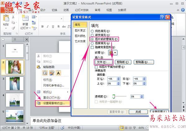 照片導(dǎo)入PPT空白文檔之后,由于照片尺寸的不同,所以有的PPT頁面會出現(xiàn)大片的空白,影響美觀。此時(shí)我們需要為PPT相冊選擇一個(gè)漂亮的背景圖片,可以是靜態(tài)或者動態(tài)的都行。單擊幻燈片頁面空白處,然后選擇背景格式設(shè)置,把背景圖片插入PPT相冊中。
