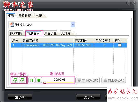 通過主界面“自定義”設(shè)置按鈕,為視頻相冊配上一段動聽的音樂,要不圖片寂靜無聲的展示,多少失了色彩,可以選擇MP3格式的音頻或MP4格式的視頻作為背景音樂都可以。