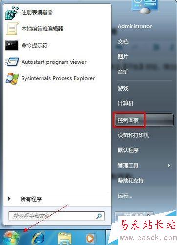 1、單擊【開始】按鈕,彈出的菜單窗口單擊【控制面板】命令