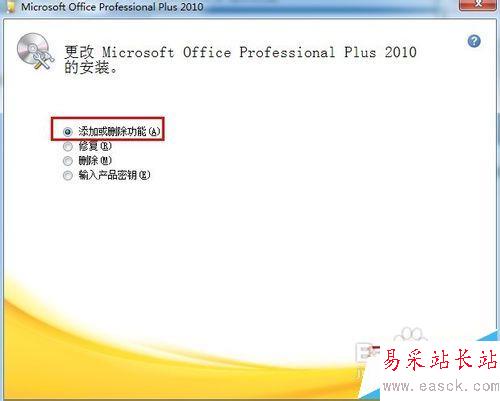 4、在【更改Microsoft Office Professional Plus 2010的安裝】界面選擇【添加或刪除功能】,單擊【繼續】按鈕