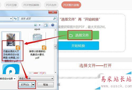 3、按鈕選擇對(duì)了之后,就可以進(jìn)行文件上傳的操作了。單擊“選擇文件”——選中需要獲取圖片的PDF——單擊“打開(kāi)”按鈕。