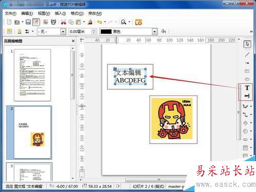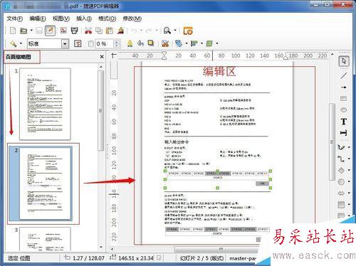 2、打開pdf文件后在左側選擇對應的頁面縮略圖,然后在右側編輯區對該頁面內容進行編輯。