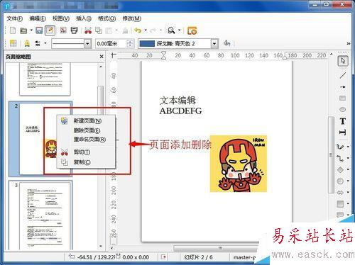 4、在文檔中間插入新的頁面內容或是刪除頁面內容可以在左側,頁面縮略圖中進行操作。