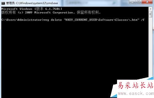 2、然后在命令行輸入【reg delete "HKEY_CURRENT_USER/Software/Classes/.htm" /f】,點擊確定刪除錯誤的項,問題解決