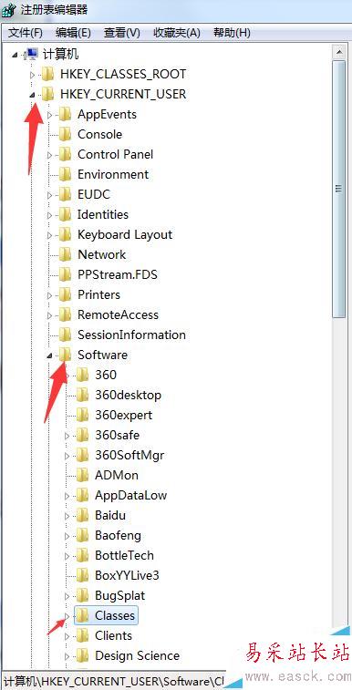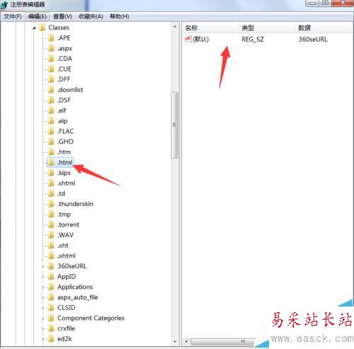 3、進入注冊表編輯器進入【HKEY_CURRENT_USER/Software/Classes/.html】項下