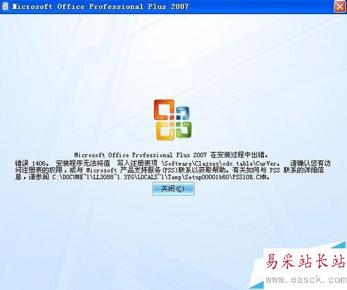 1、我們在安裝office 2007的時(shí)候,會出現(xiàn)以下信息,錯誤1406,安裝程序無法將值寫入注冊表項(xiàng),需要聯(lián)系管理員權(quán)限,導(dǎo)致無法安裝
