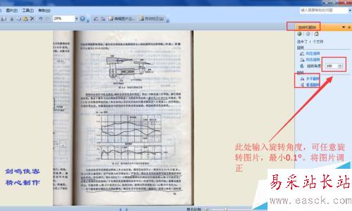 4、旋轉操作。由于掃面儀的工作區間有限,有時候,為了方便掃描,掃面后得到的圖片角度不正,是歪斜的,需要旋轉。Microsoft Office Picture Manager里有旋轉操作,可以對圖片進行旋轉,最小可以旋轉0.1°。大家可以根據自己的需要,旋轉調整圖片。