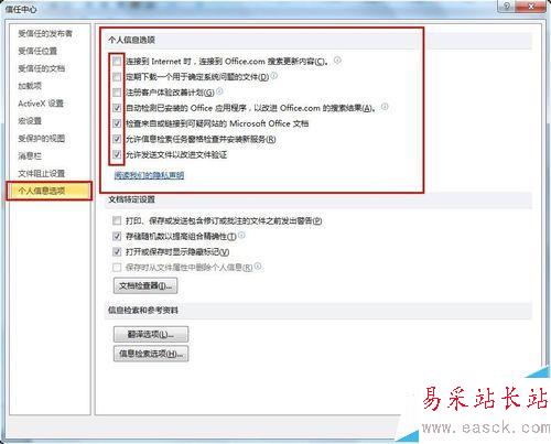 5、在“信任中心”對話框中選擇“個人信息選項”,取消所有個人信息選項的對勾,如圖: