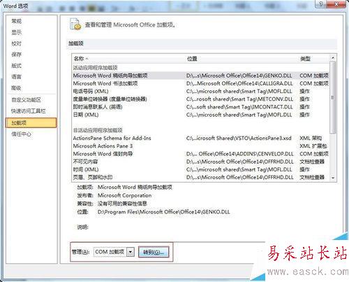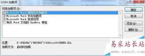 3、在“com加載項”里取消所有對勾,確定,如圖: