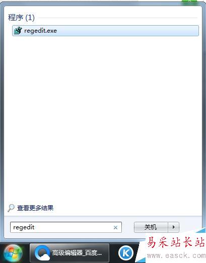 5、我們單擊左下角的開始,在下方搜索框里輸入regedit,回車或點(diǎn)擊進(jìn)入注冊(cè)表編輯器。或者用WIN+R鍵組合呼出運(yùn)行,輸入regedit進(jìn)入注冊(cè)表編輯器。