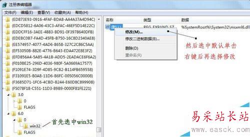 9、左邊選擇win32,然后選中右邊的默認(rèn)后右鍵單擊再選擇修改。