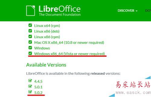 6、比如,我們的電腦安裝了 64 位的 Win10,而且我們想下載最新版的 LibreOffice,我們就可以點(diǎn)選圖中下劃紅線的選項(xiàng),即 Windows x86_64(Vista or newer required,和 5.02。