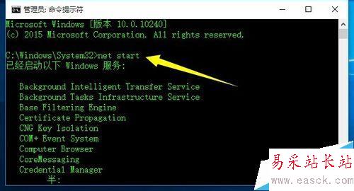 2、從打開的“命令提示符”界面中,輸入“net start”并按回車以查看當前所有已啟動的Windows服務。從中可以查看是否存在“Software Protection”或"Office Software Protection Platform”服務,如果不存在,則需要重啟此服務。如圖所示: