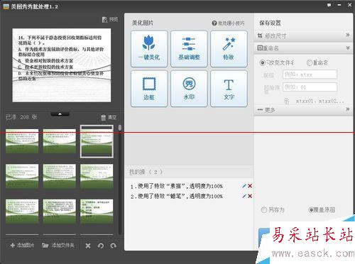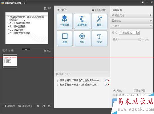 3、在特效里先選擇黑白色,再選擇素描,這時候深色背景就被去掉了,僅留下黑色字體