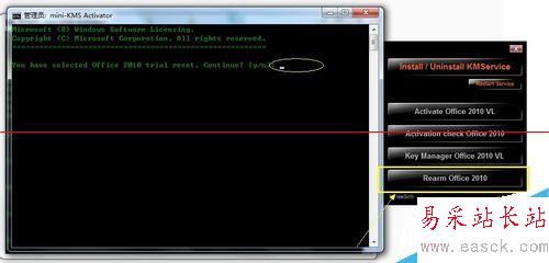 第二步,選擇框框里面的最后一個Rearm Office 2010,該步驟的意思是要重置“Rearm”,接下來的步驟同第一步:在命令提示符里面輸入“y”即可,等到出現Press any key to exit...就可以關掉命令提示符了,也要注意,右邊的框框還不需要關掉。