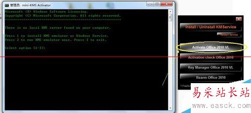 第三步,選擇框框第二個:Activate Office 2010VL,運行Activate,進行激活。在命令提示符里面提示的:elect option [1-3]:后面輸入1就可以了。等到出現Press any key to exit...就可以全部關掉了。