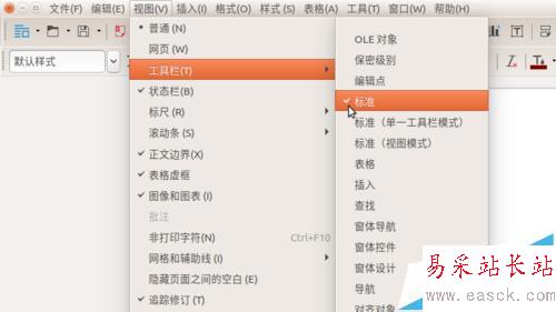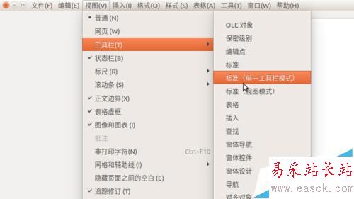 2、為了體驗新的單一工具欄模式,需要先將上述兩行工具欄關閉。依次點擊“視圖”——“工具欄”,取消掉“標準”和“格式”兩項之前的對勾。