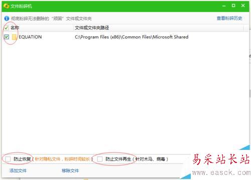 3、在彈出的對話框中選中此文件(這個步驟是360自動的),然后確認下方的兩個復選框未被勾選(勾選的話刪除速度會比較慢,針對此次刪除的目的,我們無須勾選),然后點擊右下角的粉碎文件