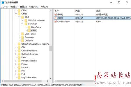 4、依次展開HKEY_LOCAL_MACHINE/SOFTWARE/Microsoft/Office/16.0/Common/OEM/OOBEMode HKEY_LOCAL_MACHINE/SOFTWARE/Wow6432Node/Microsoft/Office/16.0/Common/OEM/OOBEMode
