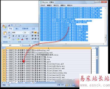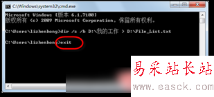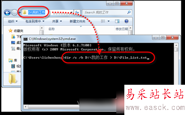 (2)在命令行工具窗口中,按照“dir /s /s <文件列表來源文件夾> > <輸出文件>”的格式輸入命令,此處為“dir /s /b D:/我的工作 > D:/File_List.txt”,其意義為將“D:/我的工作”文件夾中的所有文件和子文件夾中的文件完全路徑名提取到位于“D:/”盤根目錄的“File_List.txt”文本文件中,如圖2所示。