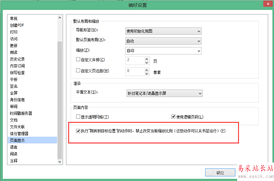 3、然后勾選上右側最底部“執行‘跳轉到目標位置’的動作時,禁止改變當前縮放比例(這些動作可以從書簽運行)”,然后確定即可。