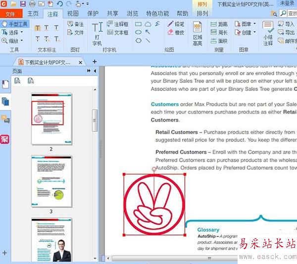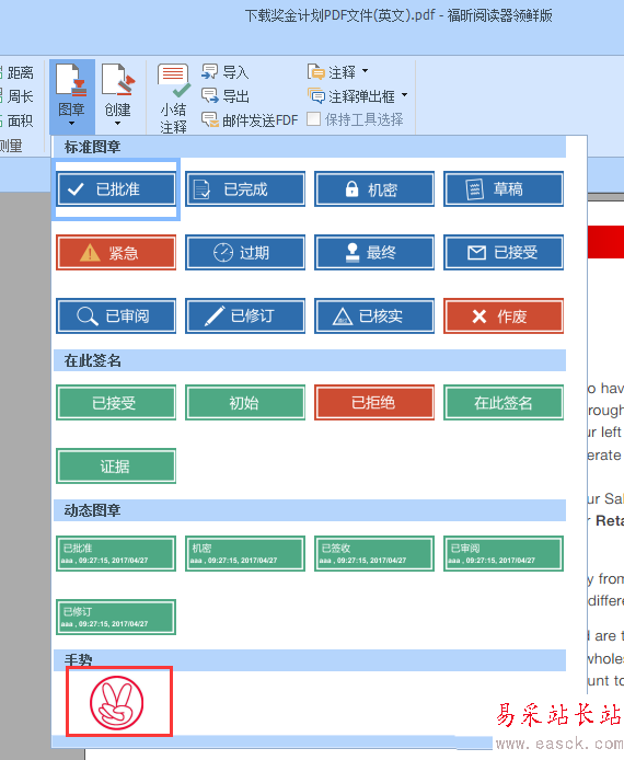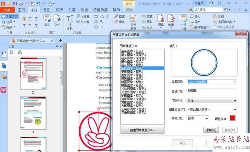 4、點擊“確定”,圖章添加成功。點擊“圖章”按鈕,選擇之前添加的圖章,就自動加入到PDF文檔中了。