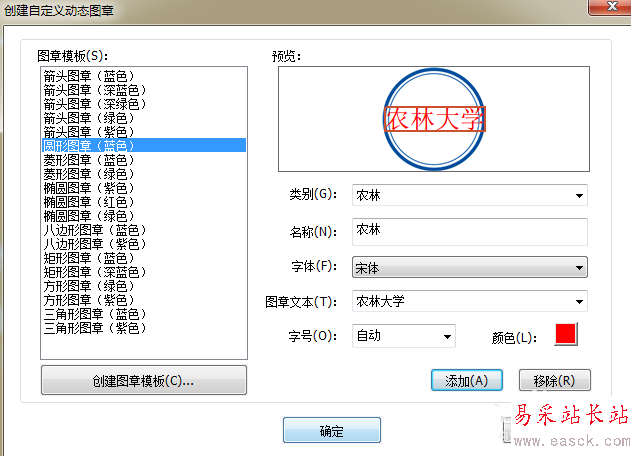 5、如果大家選擇的是“創建自定義動態圖章”,則彈出如下窗口,可以選擇系統自帶的圖章模板進行設置,也可以自己創建新的圖章模板。