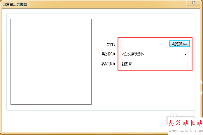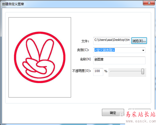 3、選擇“創建自定義圖章”,彈出自定義圖章框;添加文件,填寫類別,及名稱,根據個人所需設置圖章的透明度。
