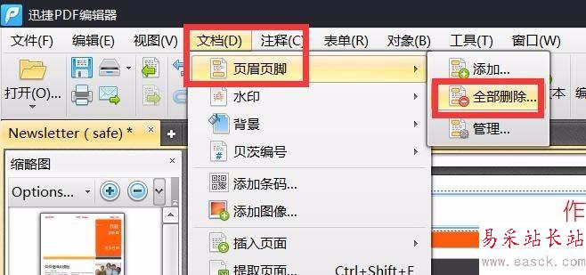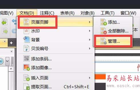 3、在打開(kāi)的PDF文件頁(yè)面中,我們選擇文檔菜單下的頁(yè)眉頁(yè)腳選項(xiàng)。