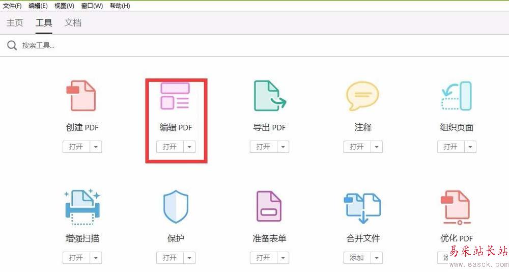 1、打開PDF文件后,在“工具”或右邊列表中選擇“編輯”PDF,選擇“水印”。