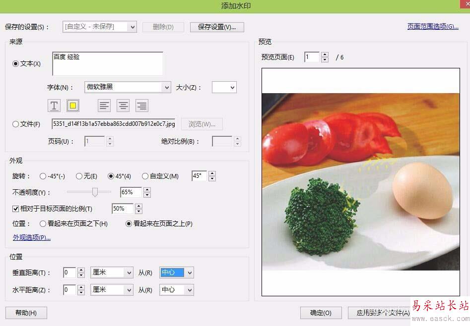 2、在“添加水印”彈框中選擇“文本”(輸入文本水印)或選擇“文件”(添加圖片水印,但注意圖片要是經過處理的透明底的PNG圖片),并調整外觀和屬性。點擊“確定”后保存文件即可。