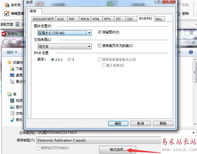3、完成識別文檔之后,自動彈出‘另存為’對話框,在另存為對話框的保存類型下拉列表中,選擇Electronic Publication(.epub),然后點擊保存;或者在文件選項卡上,點擊將文檔另存為,在出現(xiàn)的列表中選擇Electronic Publication(EPUB)。