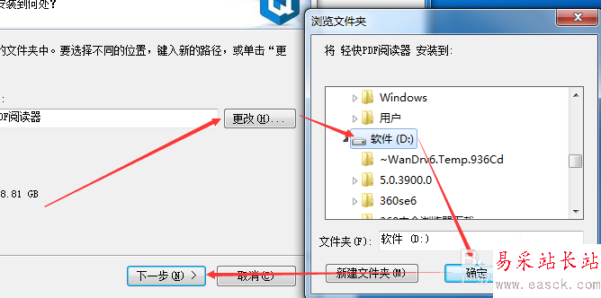 2、 單擊“打開”,在彈出的安裝頁面上點擊“下一步”。再點擊“更改”——“D盤”——“確定”——“下一步”。