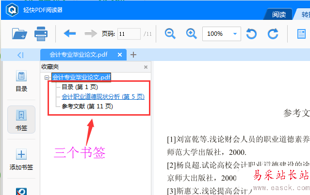 2、三個書簽添加完成后,再單擊左側的“書簽”按鈕,就可以看到剛剛我們添加好的書簽了!