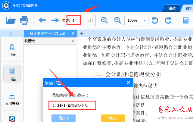 同上,在頁碼框中輸入“5”,然后按回車鍵,單擊“添加書簽”,輸入書簽名稱:會計職業道德現狀分析