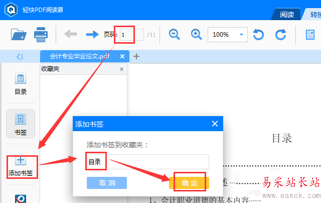 在界面上方的頁碼輸入框中輸入“1”,然后按回車鍵;接著單擊左側的“添加書簽”按鈕,在彈擊的輸入框中輸標簽名稱:目錄
