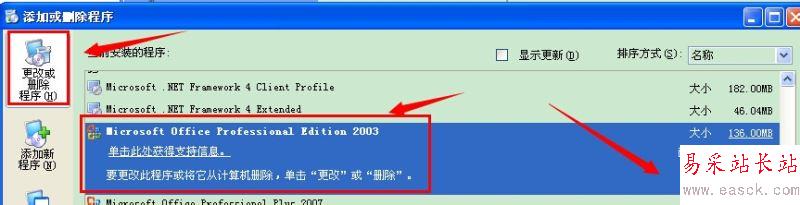 2、在“更改和刪除程序”中找到“Microsoft Office Professional Edition 2003”,點擊“更改”: