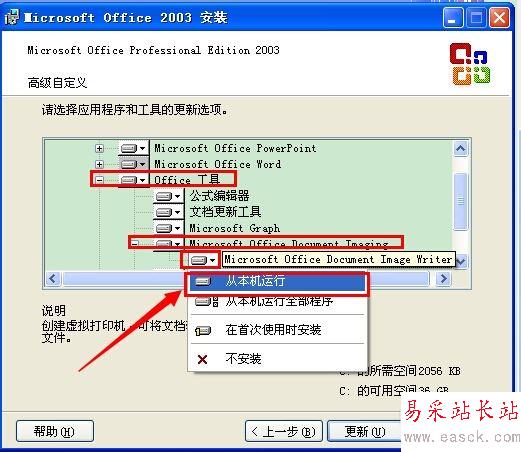 5、再看到窗口里的Office 工具,選擇Microsoft Office Document Imaging,打開后看到那個倒三角,點擊后選擇“從本機運行”,沒安裝的是X,安裝了的就沒反應,點擊更新: