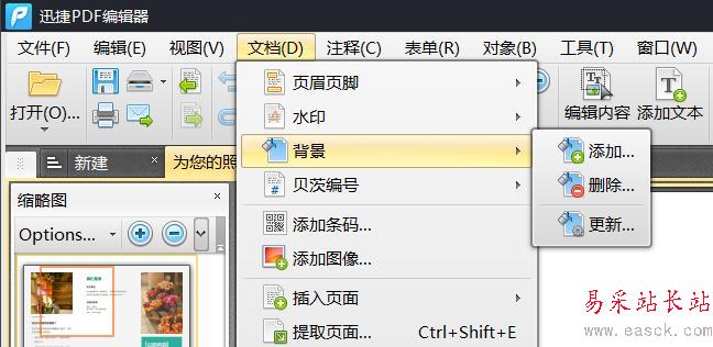 2、接下來我們就可以使用PDF編輯器來打開相應(yīng)的PDF文件了。在PDF編輯器菜單欄中點擊文檔菜單,在文檔下拉菜單中我們選擇背景選項,點擊添加按鈕。