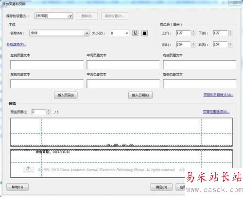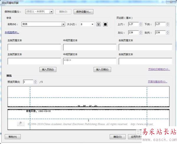 3、點擊“頁眉和頁腳”旁邊的黑色三角符號,下拉菜單里有添加頁眉和頁腳,點擊彈出如下對話框??梢詫撁柬撃_的格式進(jìn)行設(shè)置,頁碼也屬于頁眉頁腳的一部分。中部的六個方框用于填入你需要的內(nèi)容,可以根據(jù)你的需要將鼠標(biāo)定位在其中一個方框內(nèi),然后點擊插入頁碼。則可以在下方的預(yù)覽框中看到效果。