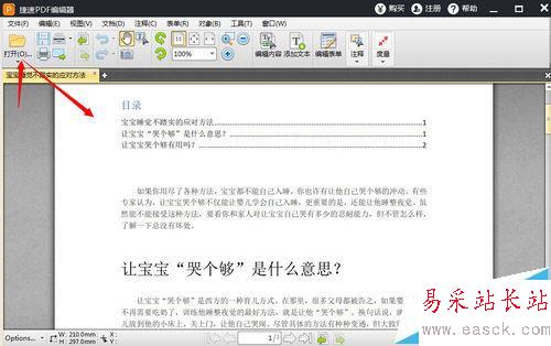 2、打開pdf編輯器,再單擊編輯器的打開按鈕,打開要編輯的pdf文件,文件打開后可以清楚的看到;
