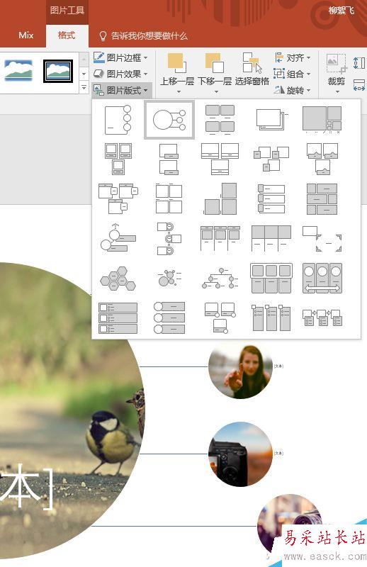 然后切換到“圖片工具-格式”選項卡,點擊工具欄中的“圖片版式”,將會發現打開的其實是SmartArt圖形。光標從不同的樣式上滑過,可以即時預覽拼圖的效果。