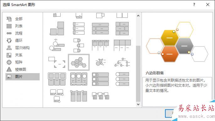 在打開的SmartArt對話框中,選擇一個喜歡的圖形樣式。