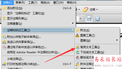 4、點擊了注釋和標記工具的選項之后,彈出了下一級菜單選中為高亮文本工具的選項。