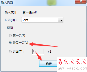 6、就會(huì)彈出了的一個(gè)插入頁面的窗口中,進(jìn)行勾上最后一頁的選項(xiàng),進(jìn)行點(diǎn)擊確定。